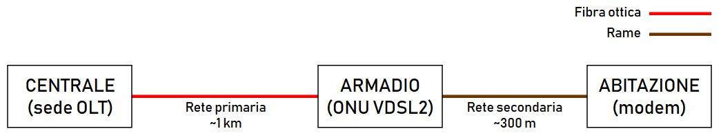- FTTC = Fiber To The Cabinet (fibra fino all’armadio, o “fibra mista rame” secondo la nomenclatura AGCOM)