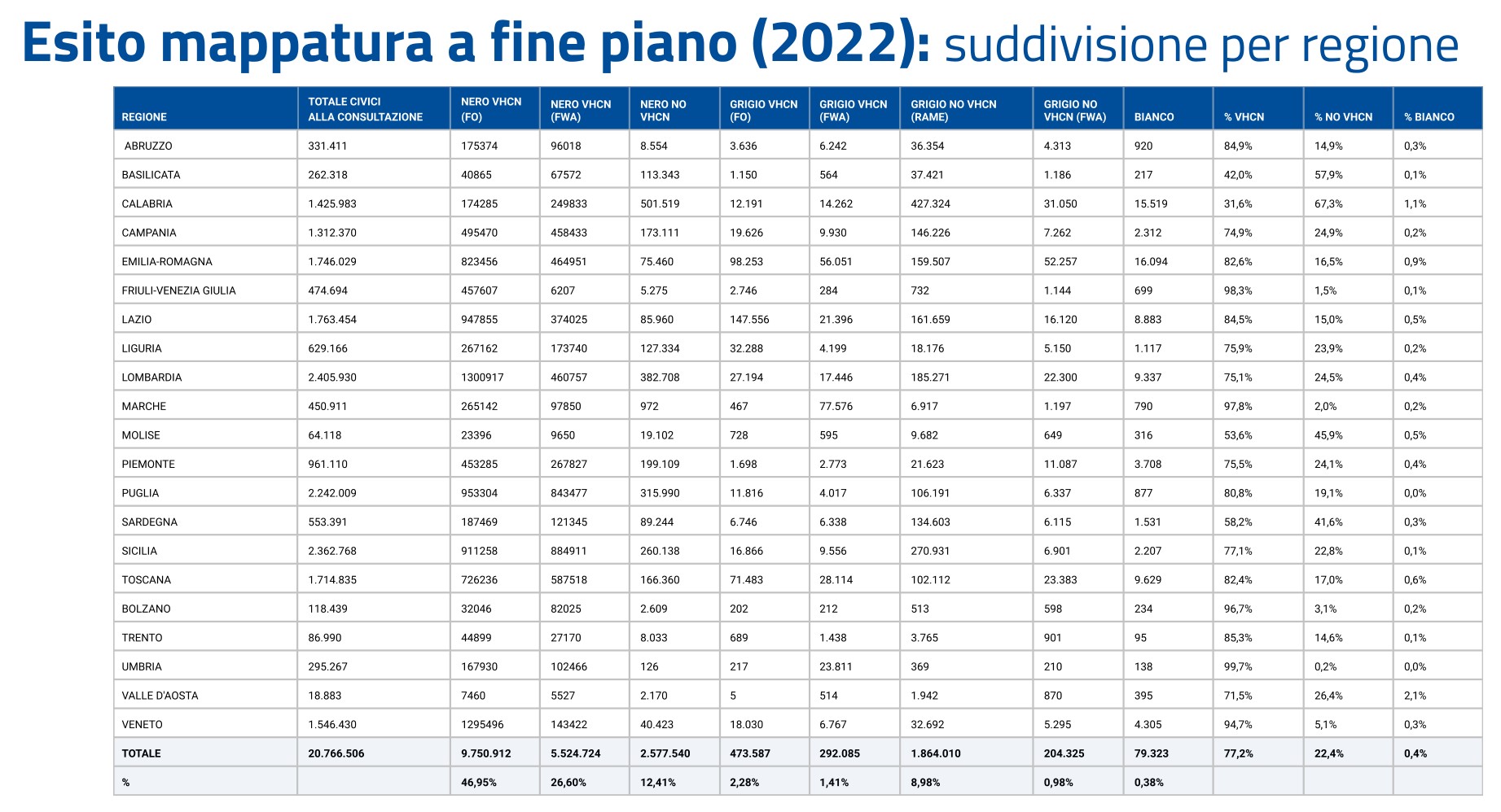 Dai risultati emerge che a fine 2019 3,6 milioni civici non risultavano coperti da nessuna rete a banda ultralarga. A fine 2022, 80mila di questi civici continueranno a non risultare coperti, e sono quindi diventati “nuove aree bianche”.