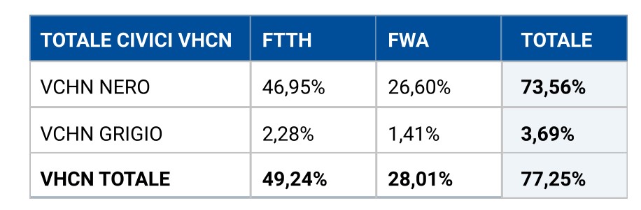 Dei civici grigi e neri, a fine 2022 il 77% risulterà coperto da almeno una rete VHCN, il 49% in FTTH e il 28% in FWA con fibra ottica alla postazione radio. (Questa classificazione non tiene in considerazione l’effettiva velocità di accesso.)