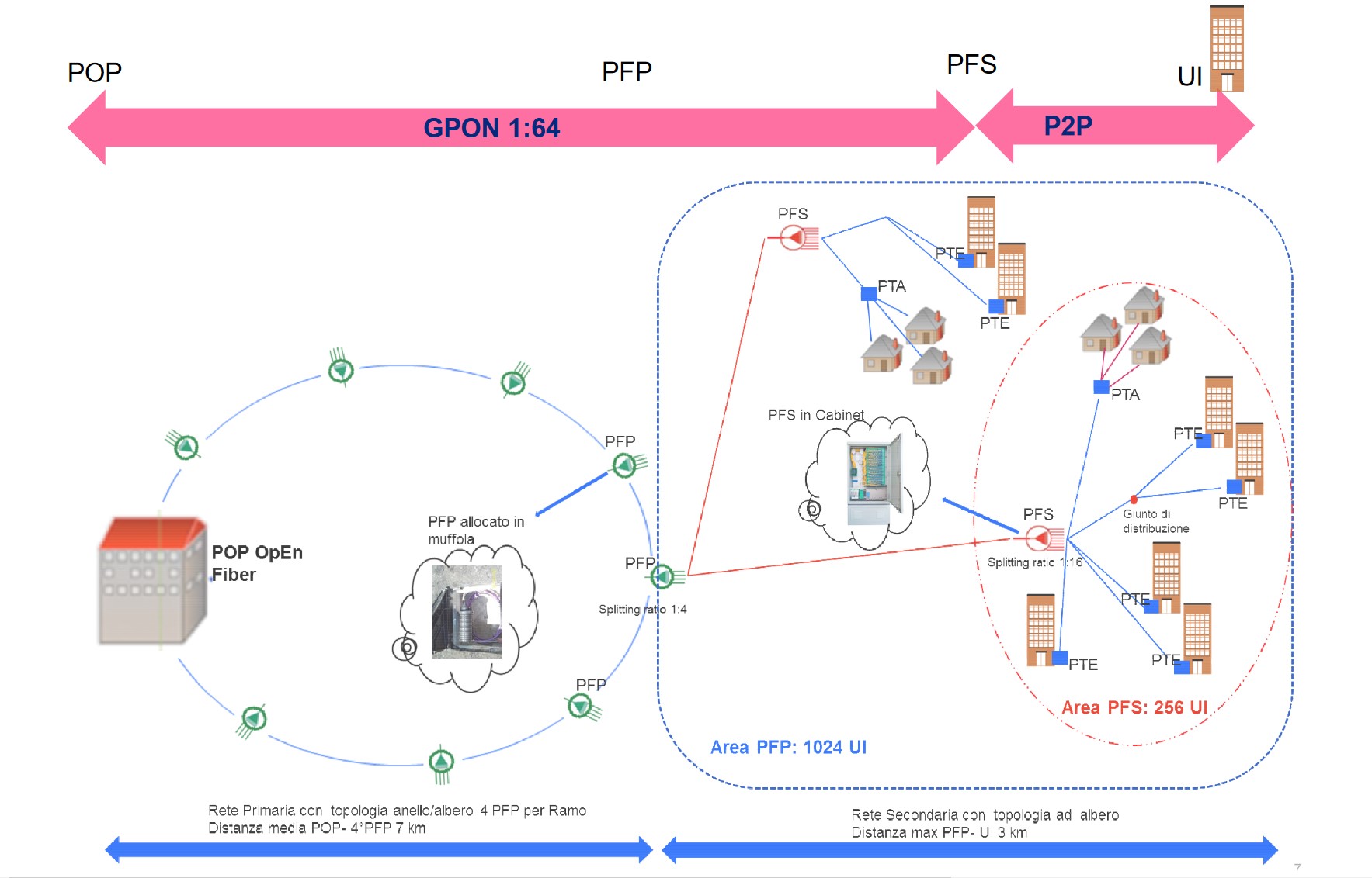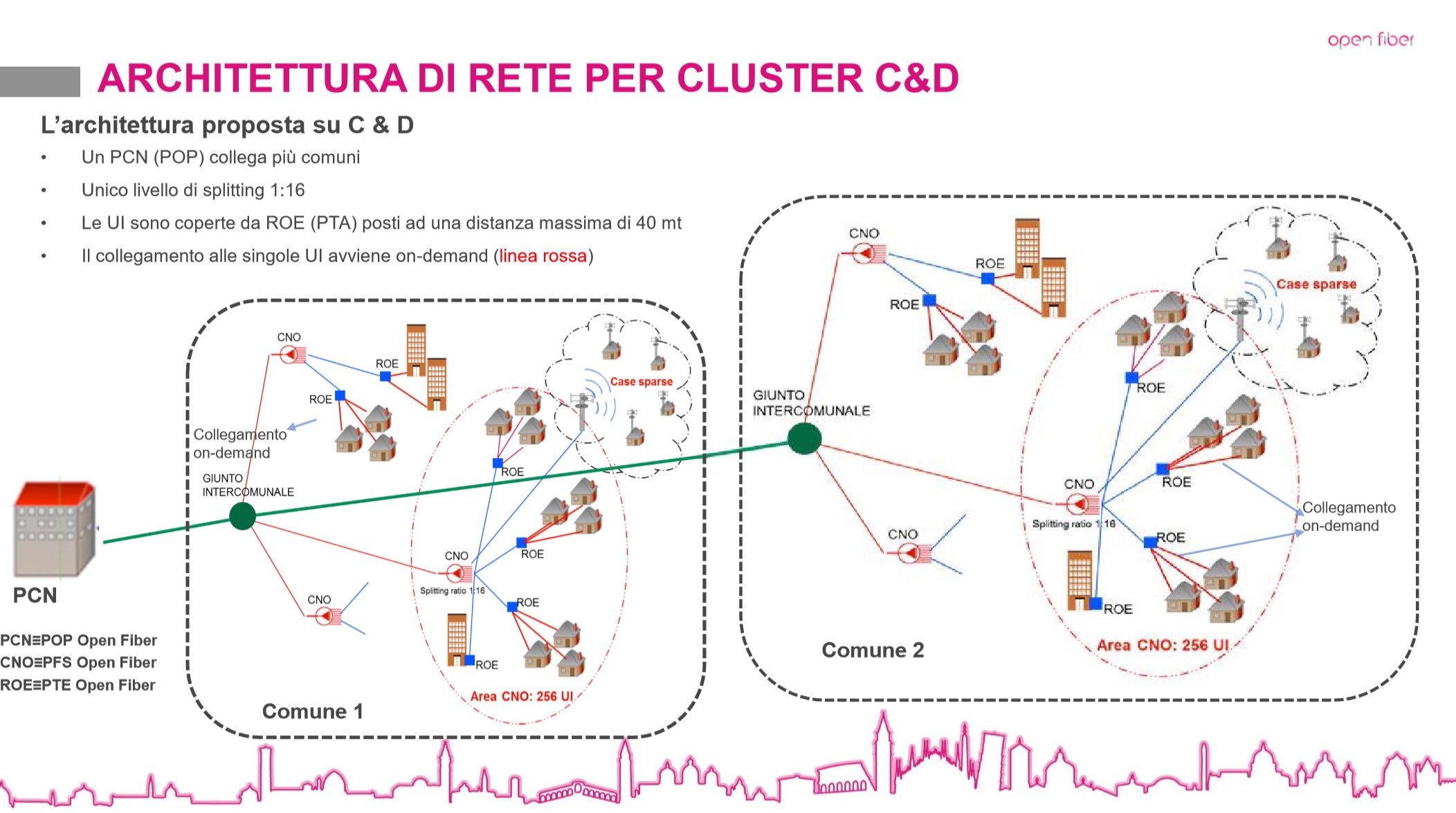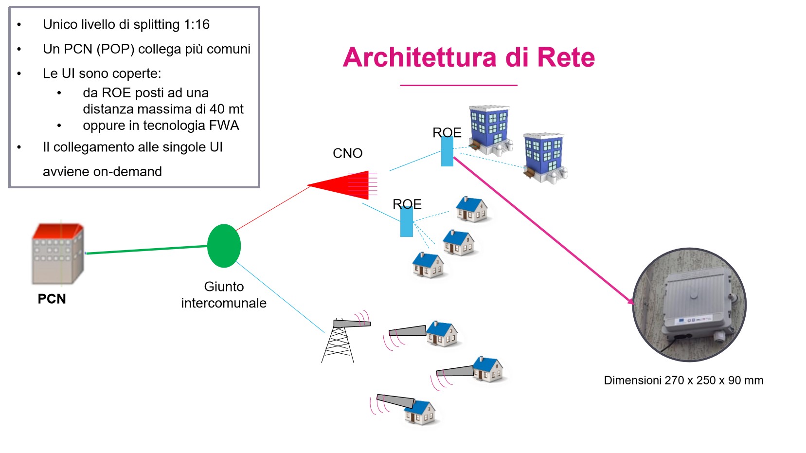 Come conseguenza, il livello di splitting è soltanto uno ed è effettuato nel CNO (Centro Nodale Ottico), collegato a un PCN (Punto di Consegna Neutro), che è l’equivalente del POP ma è quasi sempre condiviso tra più comuni.4