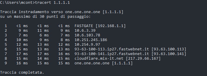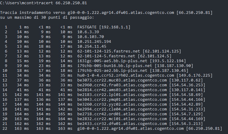 Tutti gli operatori di tipo Tier 1 sono quindi in peering tra loro, e fanno in questo modo da “collage” di Internet. Uno di questi operatori è italiano, si chiama Telecom Italia Sparkle e gestisce una vasta rete di dorsali in tutto il mondo. Altre reti Tier 1 note sono ad esempio quelle di Telia, Lumen (in passato CenturyLink), che comprende la rete Level 3, e GTT, nomi che si trovano spesso quando si eseguono traceroute.