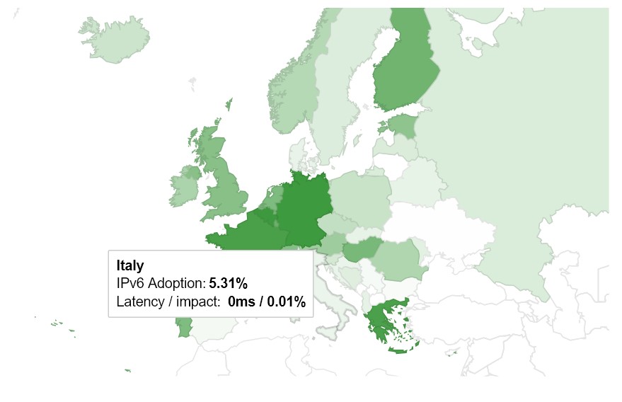 Secondo le statistiche pubblicate da Google, a gennaio 2022 il traffico IPv6 in Italia si attestava al 5,31% del totale, mentre globalmente era attorno al 35%.23 Nel momento in cui questo articolo è stato aggiornato, in Italia tra i grandi operatori solo tre offrivano IPv6: Fastweb tramite tunnel 6rd e Sky Wifi e Iliad nativamente (rispettivamente con MAP-T e MAP-E per IPv4).24