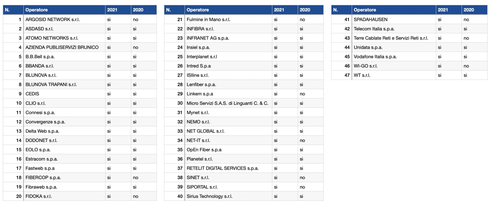 Mappatura 2021 reti fisse a banda ultralarga: consultazione degli operatori https://www.infratelitalia.it/archivio-documenti/documenti/mappatura-2021-reti-fisse-a-banda-ultralarga-consultazione-degli-operatori ↩︎ ↩︎ ↩︎ ↩︎