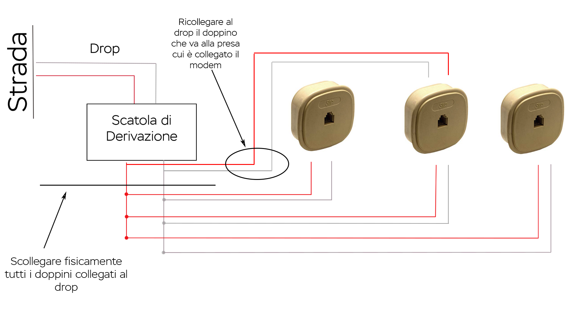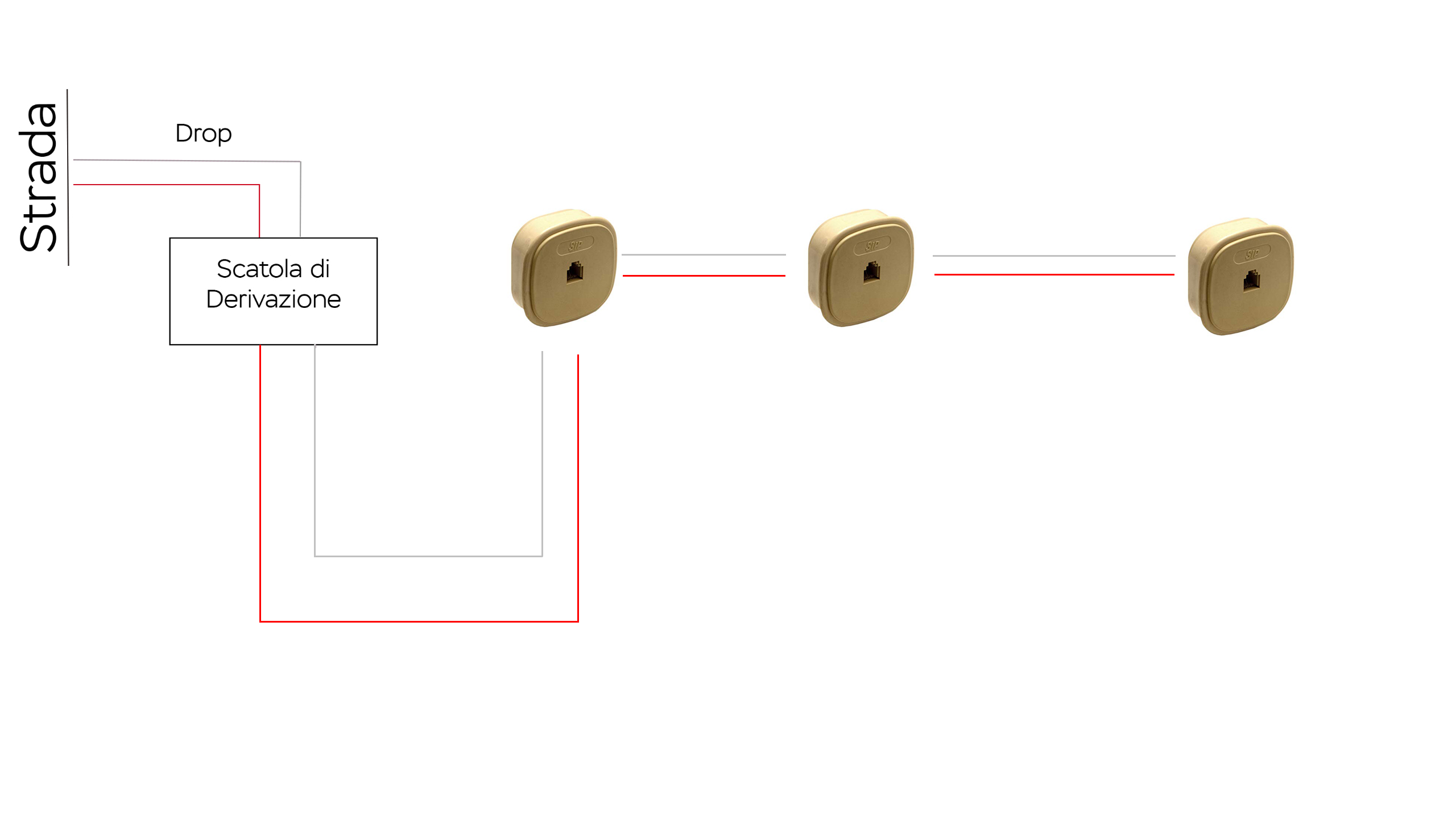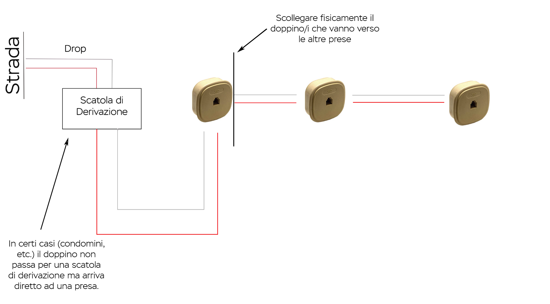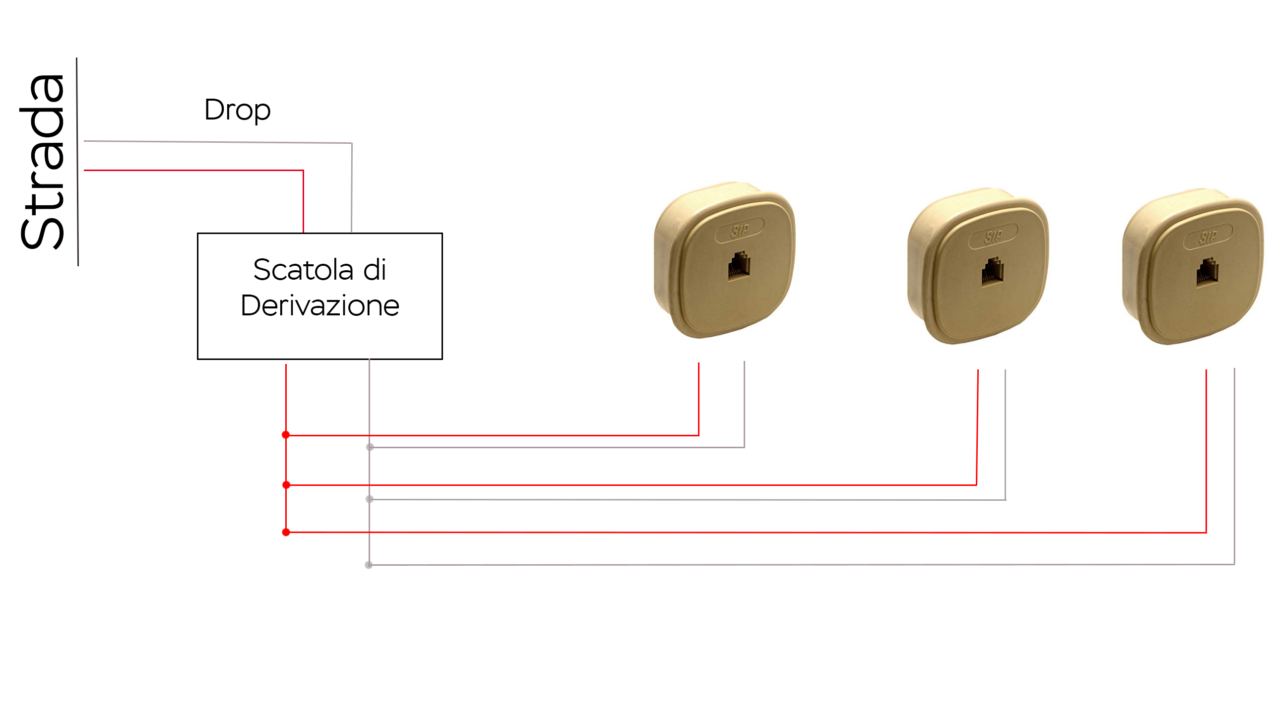 In Italia esistono due situazioni comuni quando in una abitazione si hanno più prese telefoniche. Assumendo che il drop arrivi direttamente in una scatola di derivazione (analogamente se arriva in una presa di casa) si può avere che: