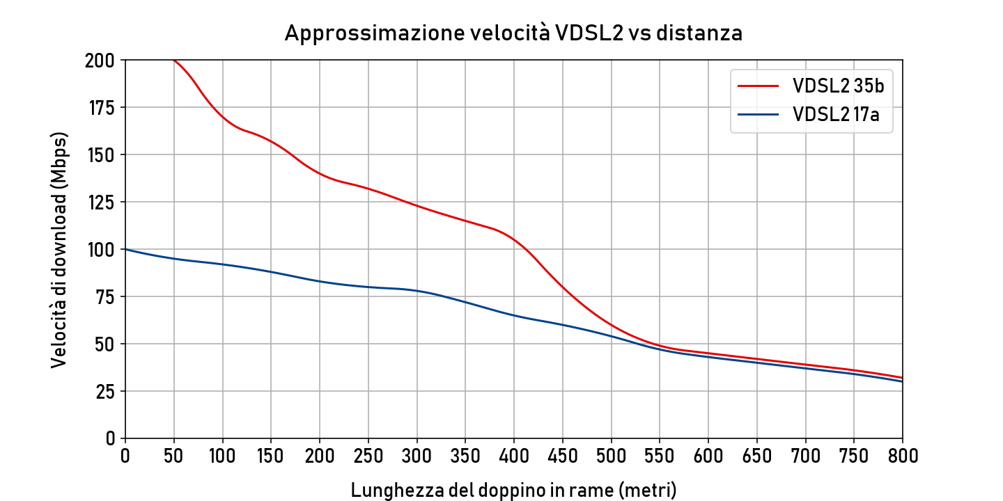 Lo svantaggio è che la velocità diminuisce rapidamente con l’aumentare della lunghezza dei cavi in rame. Per questo motivo solitamente la VDSL2 viene erogata da punti di distribuzione posizionati su strada, accanto agli armadi ripartilinea TIM o nelle immediate vicinanze. In questo modo si stima che la distanza media dalle abitazioni sia di 300 metri.2
